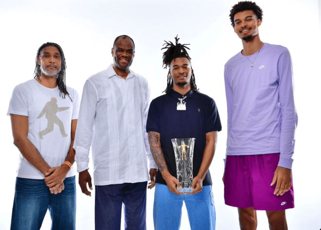 其他人对文班亚马的身高有什么说法?今年5月初,我们在The Bounce栏目中发现了一张有趣的照片:斯蒂芬-卡斯尔(NBA最佳新秀)与其他曾获此奖项的马刺队球员同框,除了卡斯尔,还有文班亚马、蒂姆-邓肯和大卫-罗宾逊。但没人关注卡斯的高光时刻——因为文班亚马和另外两位大个子的身高差距实在太悬殊了。