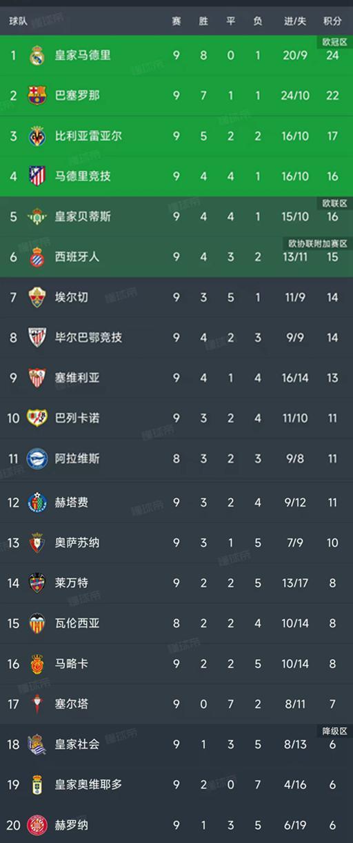 西甲第9轮结束了9场比赛,最新积分榜如下!