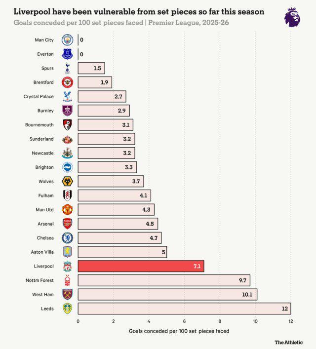 定位球攻防,利物浦都是英超倒数